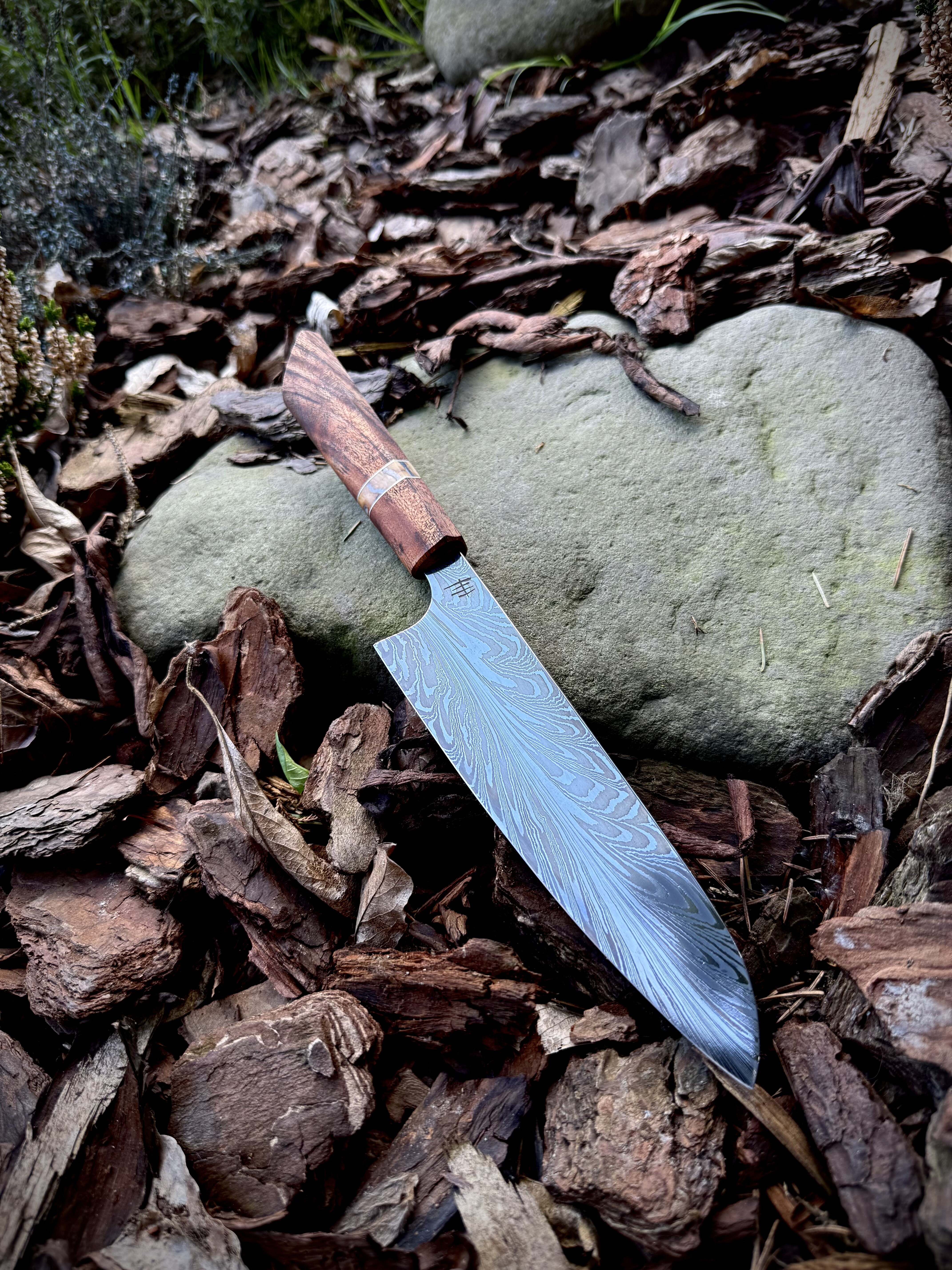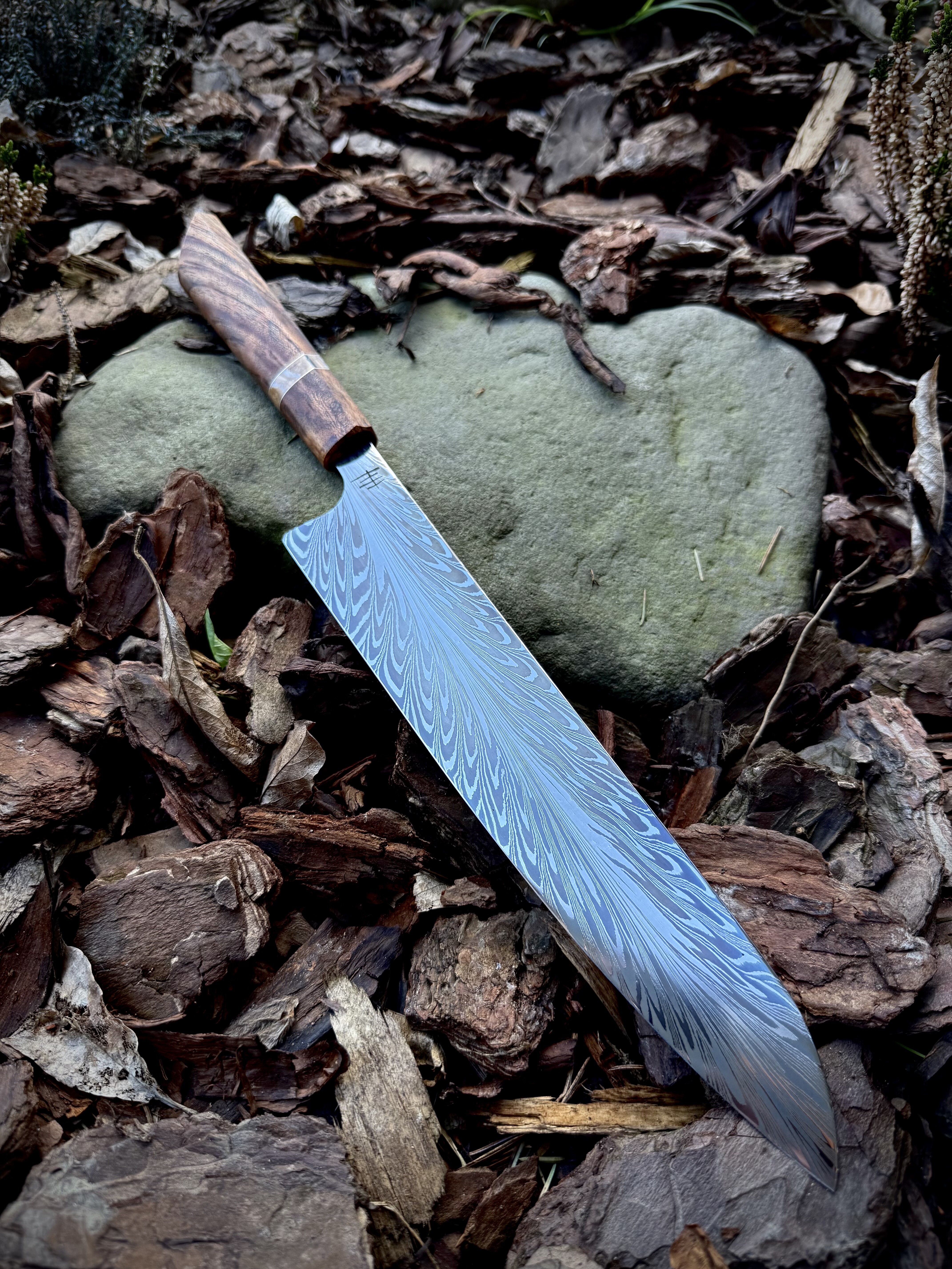 Feather Damascus Kitchen Knife Set – A Fusion of Craftsmanship and LuxuryWe proudly present a unique set of kitchen knives crafted from damascus steel featuring the Feather Damascus pattern, made from the highest quality k720 and 15n20 steel. This intricate feather-like pattern is the result of skilled blacksmithing and repeated forging, creating blades that are not only visually stunning but also exceptionally durable and sharp.The set includes:• Large Gyuto – a versatile chef’s knife for precise slicing, chopping, and dicing• Small Gyuto – ideal for everyday kitchen tasks such as cutting vegetables, fruit, and smaller cuts of meat• Ko-Santoku – a compact santoku knife, perfect for quick and accurate cutsEach handle is crafted from mahogany and stabilized mammoth tooth, giving every knife a unique, luxurious character and an excellent grip.The Feather Damascus knife set, made from k720 and 15n20 steel, is a proposal for enthusiasts of quality, distinctive design, and traditional craftsmanship – perfect for both cooking aficionados and professional chefs