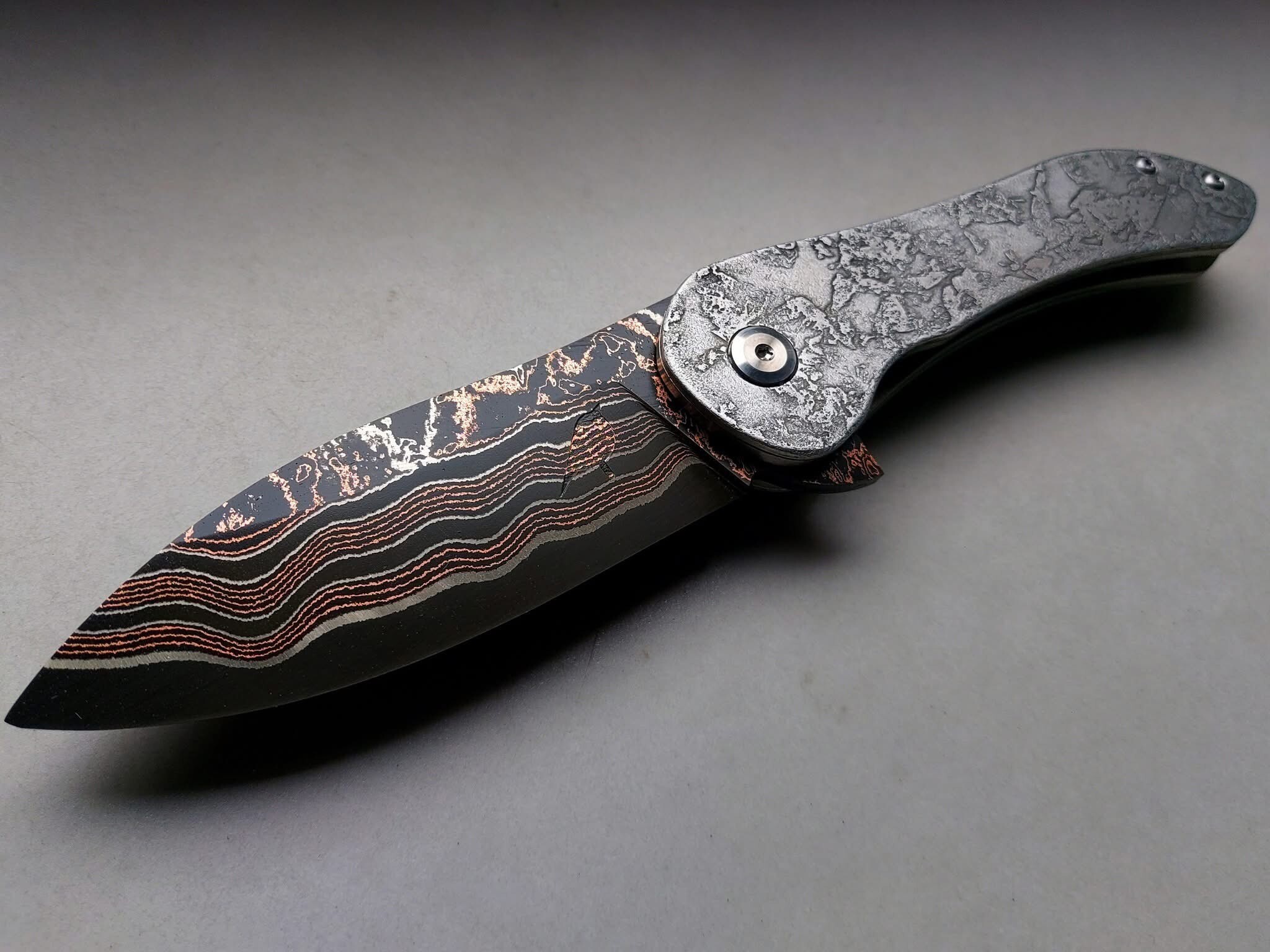 Wzór Black River pięknie wyróżnia się zarówno na dużych powierzchniach, jak i na profilowanych kształtach ostrzy. Warstwy miedzi i niklu błyszczą na ciemnym tle stali, tworząc spójną, naturalną kompozycję inspirowaną geologią – jak przekrój złożonych osadów rzecznych lub żył mineralnych w skale.