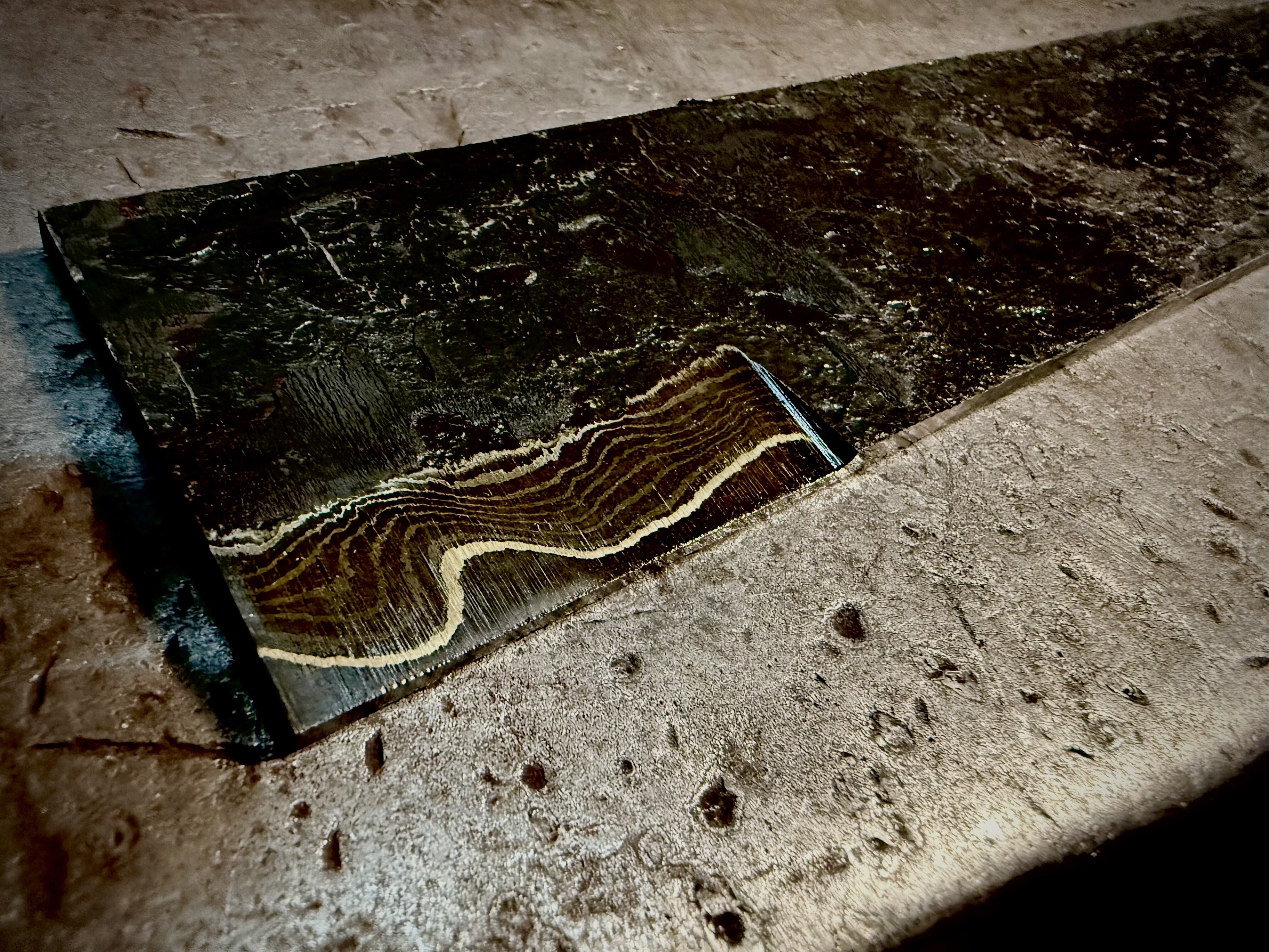 Boki: Damast węglowy o charakterystycznym losowym wzorze.