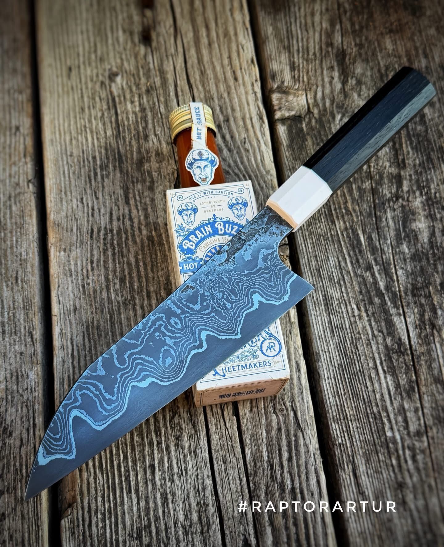 To laminat Go-Mai stworzony dla najbardziej wymagających producentów noży. Rdzeń wykonany jest z wysokowęglowej stali NMV, znanej z doskonałej twardości i długotrwałej trwałości ostrza. Rdzeń oddzielony jest od zewnętrznych warstw cienką, jasną warstwą niklu, która podkreśla kontrast między strefami laminatu i wizualnie wzmacnia strukturę. Boki wykonane są z klasycznego damastu skuwanego o losowym wzorze, co nadaje każdemu prętowi unikalny i organiczny wygląd.