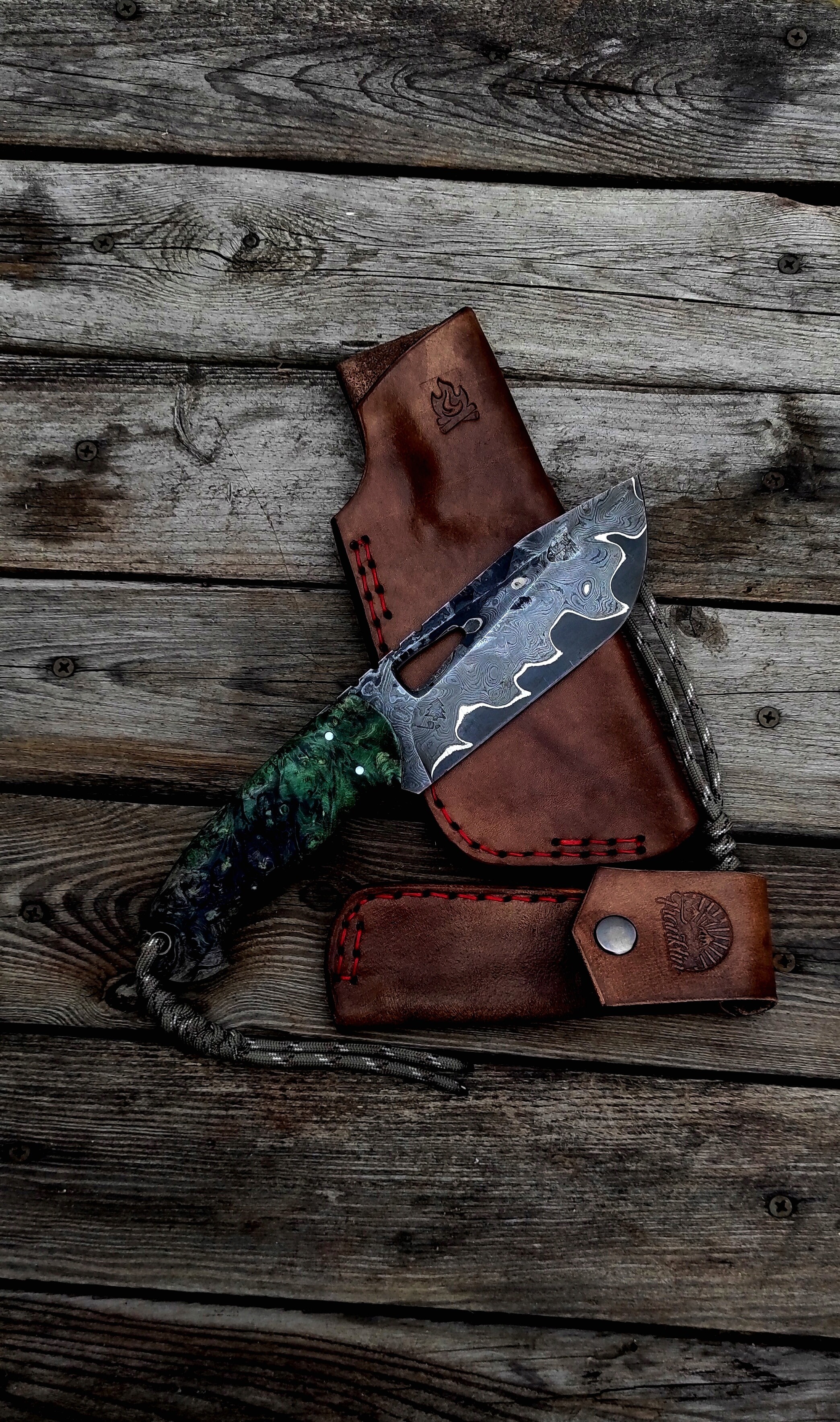 • Boki: Precyzyjnie wykończona, spawana metodą wzorzystą stal damasceńska, podkreślająca szlachetność materiału.