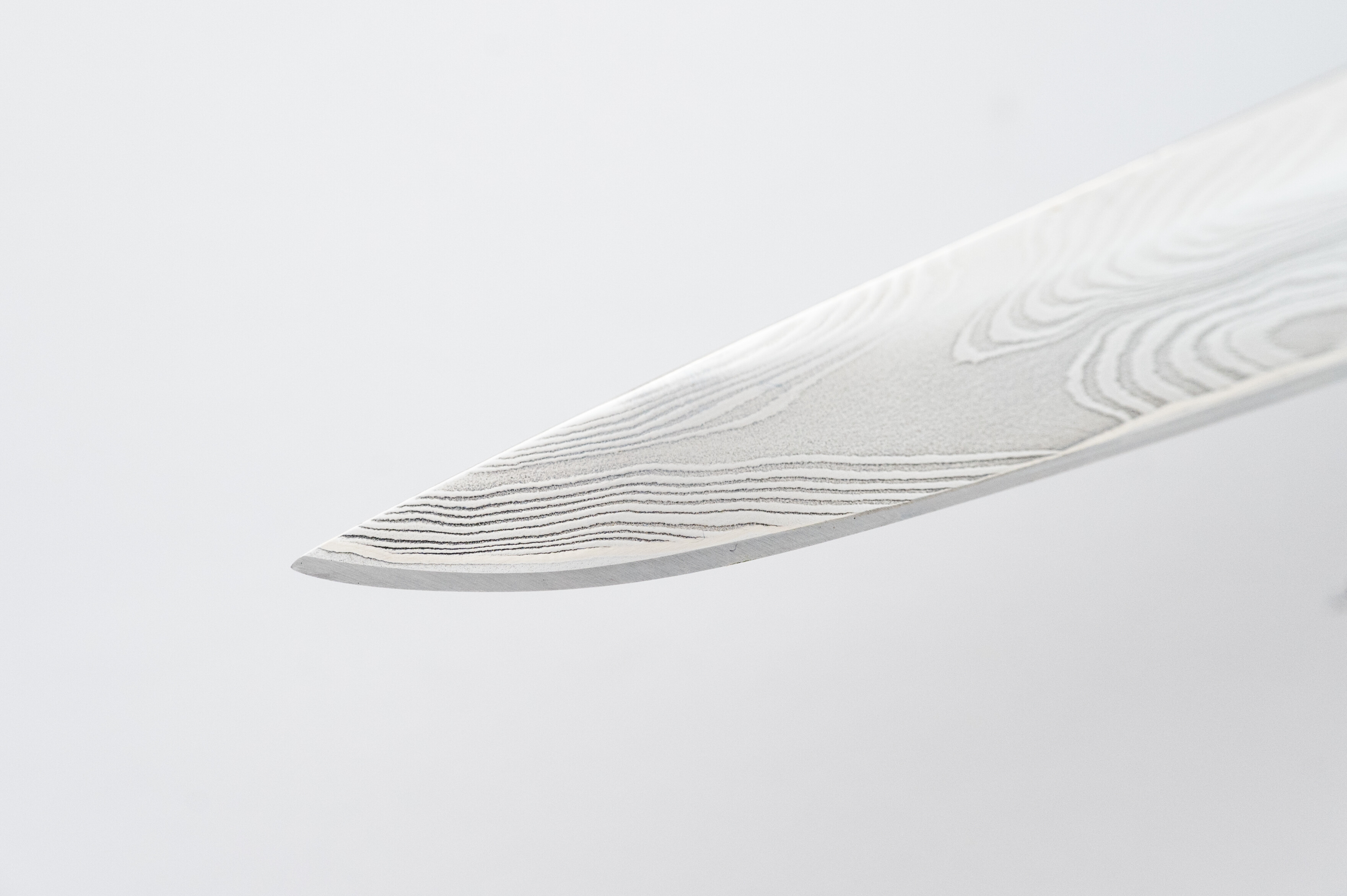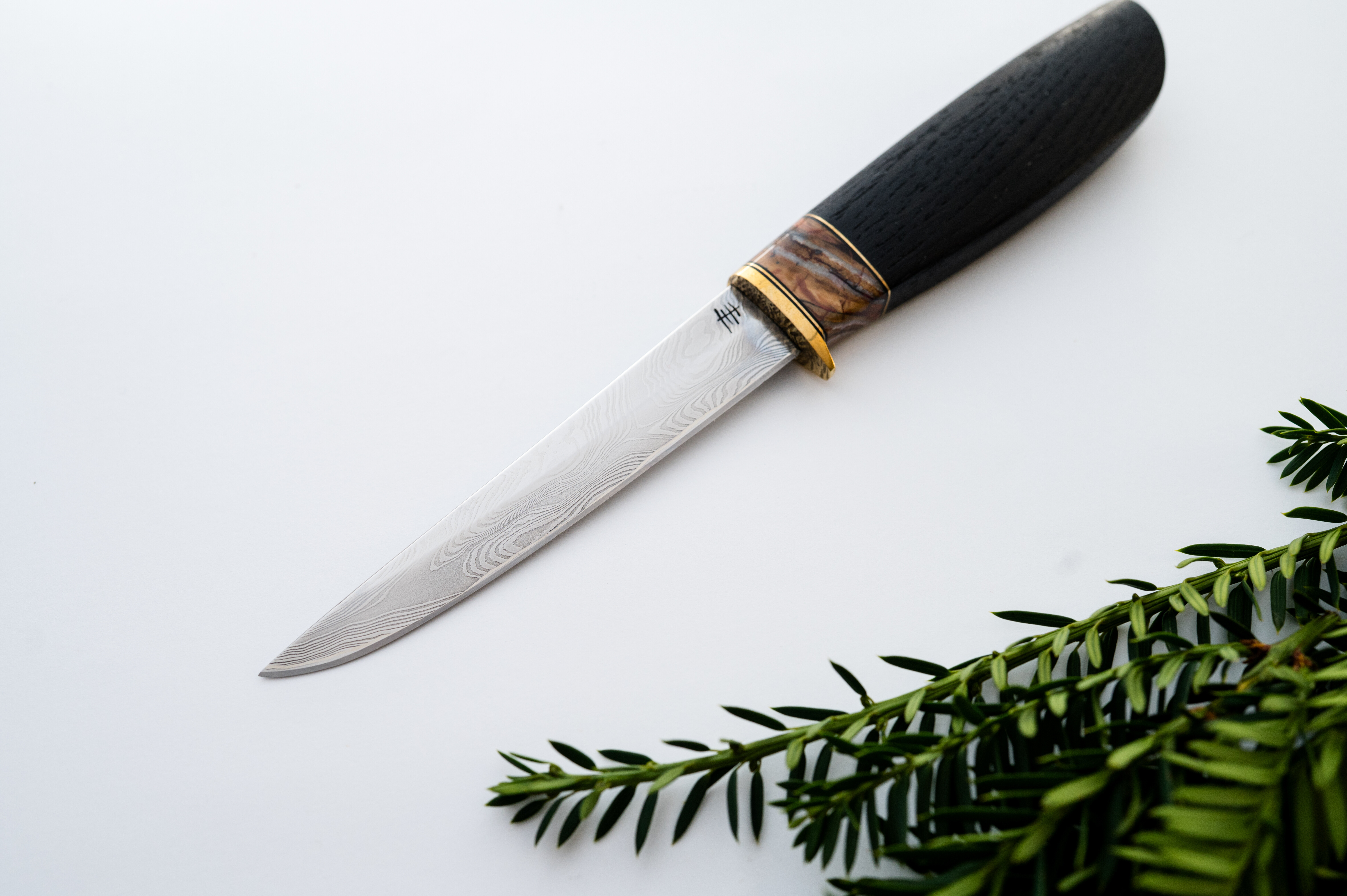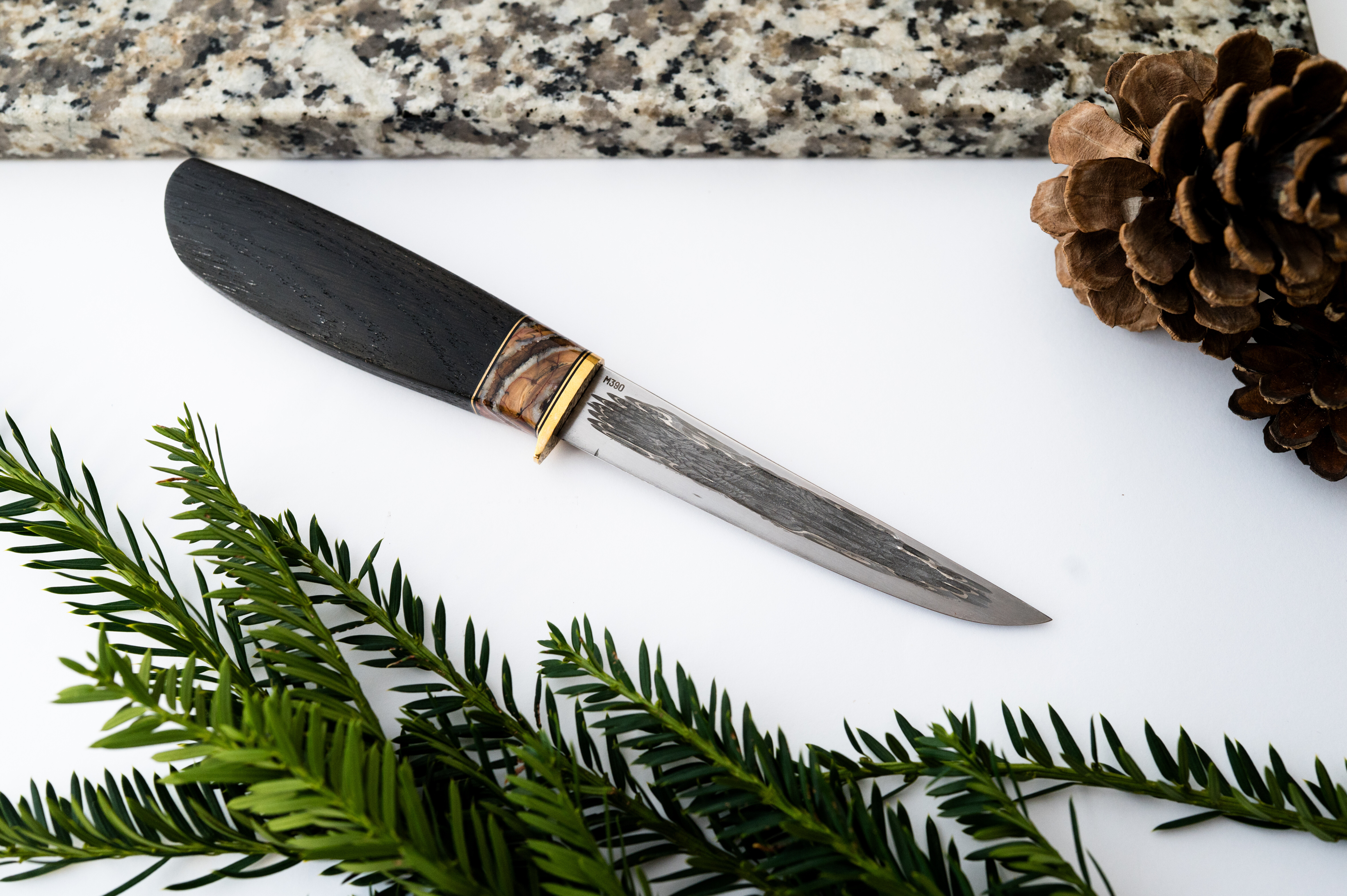 A design created with anglers and hunters in mind. The thin, slender blade is perfect for dressing game and even filleting smaller fish! The fully stainless Damascus steel composition and M390 powder-coated stainless steel edge will satisfy the needs of those who don’t want to worry about rust on their blades.The handle, crafted by Krzysztof Kołatka, is also a non-standard solution for a knife from the Yakut region. However, it was designed to provide a secure and comfortable grip for its intended purpose and its rigid geometry.